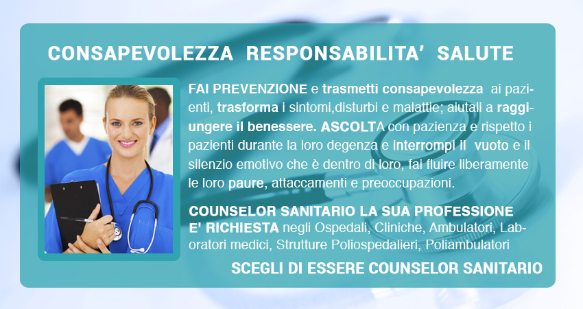 Il Percorso Professionale di Counselor Sanitario è un percorso di crescita personale e professionale; attraverso lo studio di diverse metodologie e l’esperienza pratica del tirocinio, impari a conoscerti meglio, a sentire, a scoprire capacità, talenti e forza interiore per trasmettere consapevolezza, forza e coraggio non solo ai pazienti ma anche alle famiglie, ai collaboratori sanitari, medici e infermieri per ritrovare e sentire se stessi.